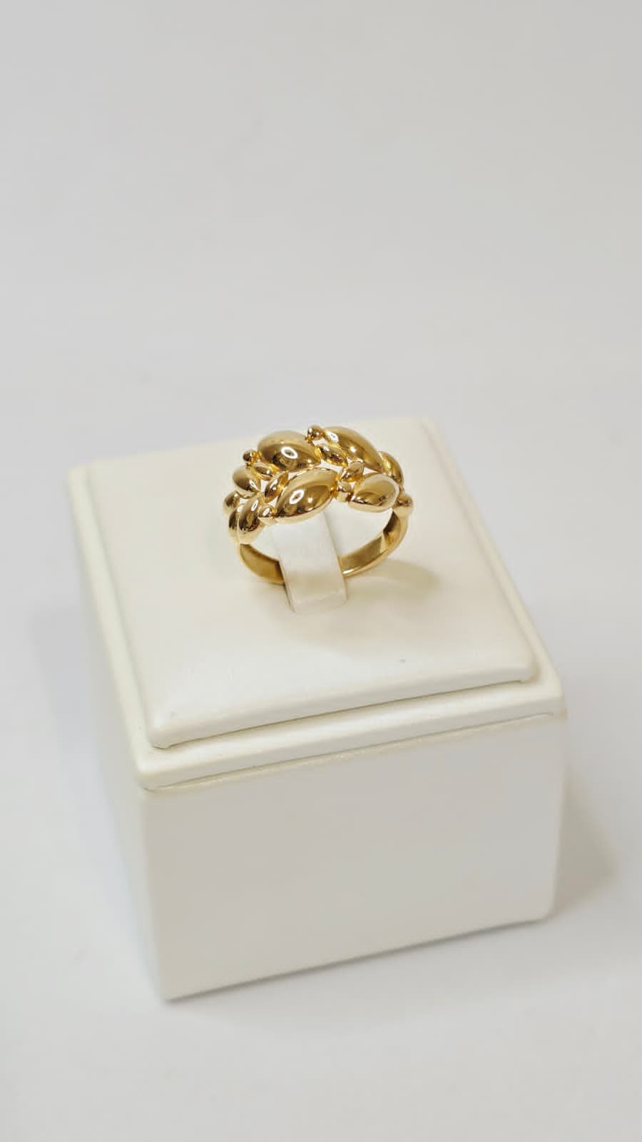 Este anillo dorado presenta un exclusivo diseño inspirado en hojas, compuesto por delicadas formas tipo marquise que se entrelazan armoniosamente para crear un efecto voluminoso y elegante. Su acabado pulido de alto brillo realza la luz y aporta un aspecto sofisticado y refinado.