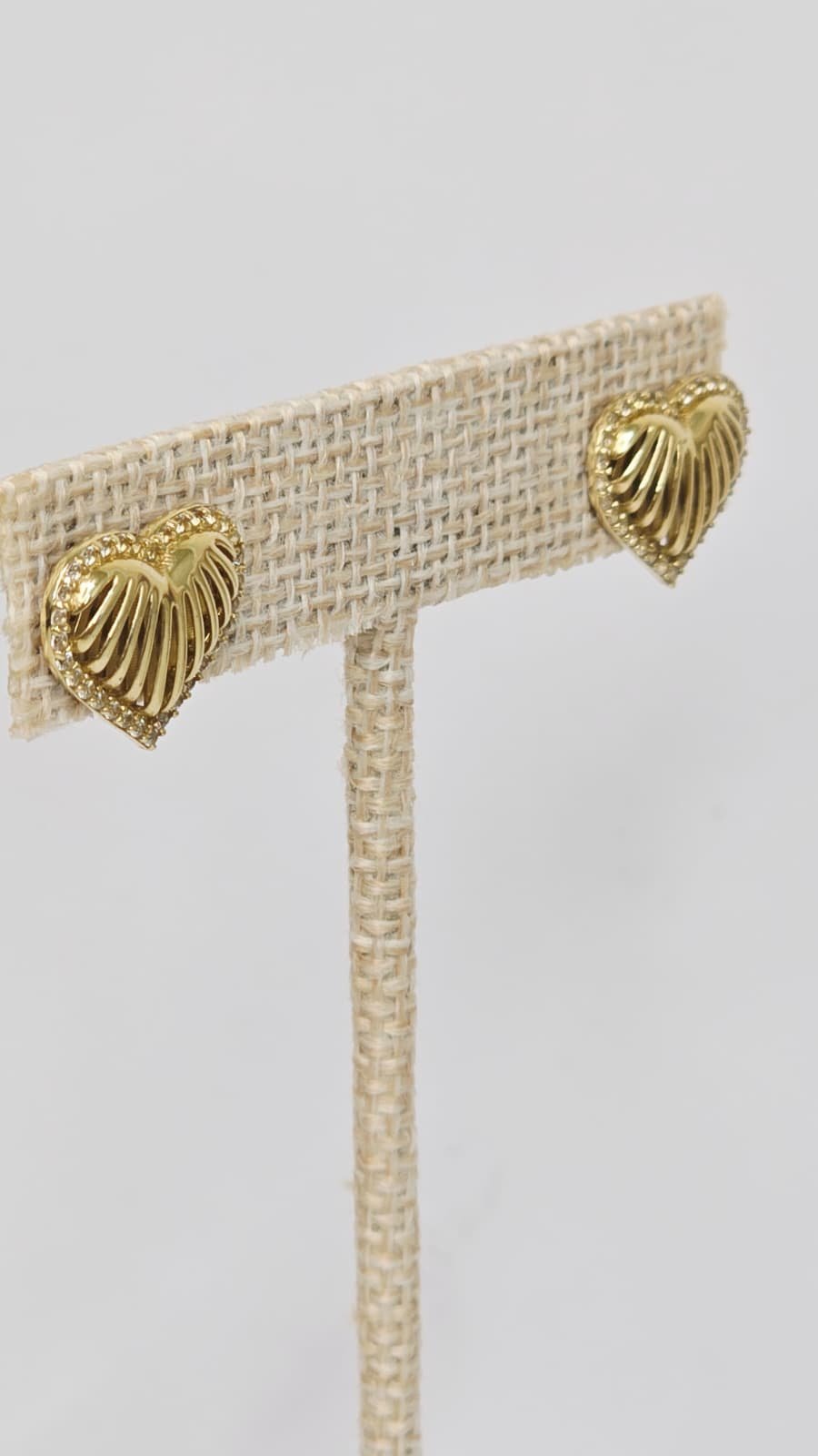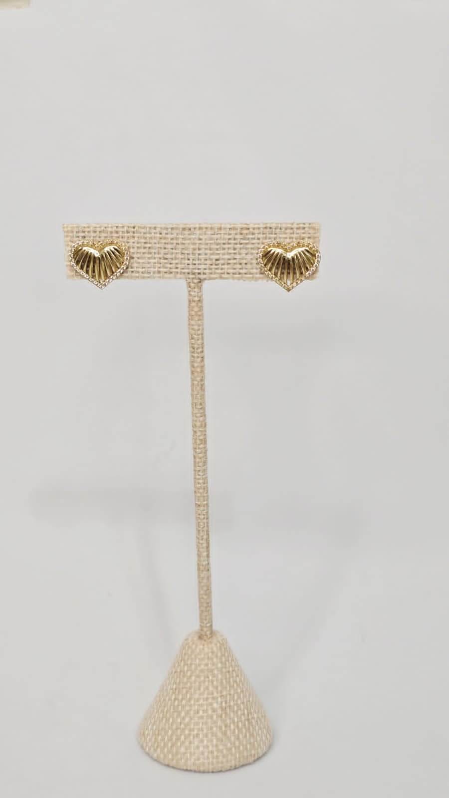 Eleva tu estilo personal con estos exclusivos broqueles de corazón, diseñados para capturar la luz desde cualquier ángulo. El centro de cada pieza presenta un acabado acanalado o «pleated» en tono dorado, creando un efecto visual dinámico que emana del centro hacia afuera.
