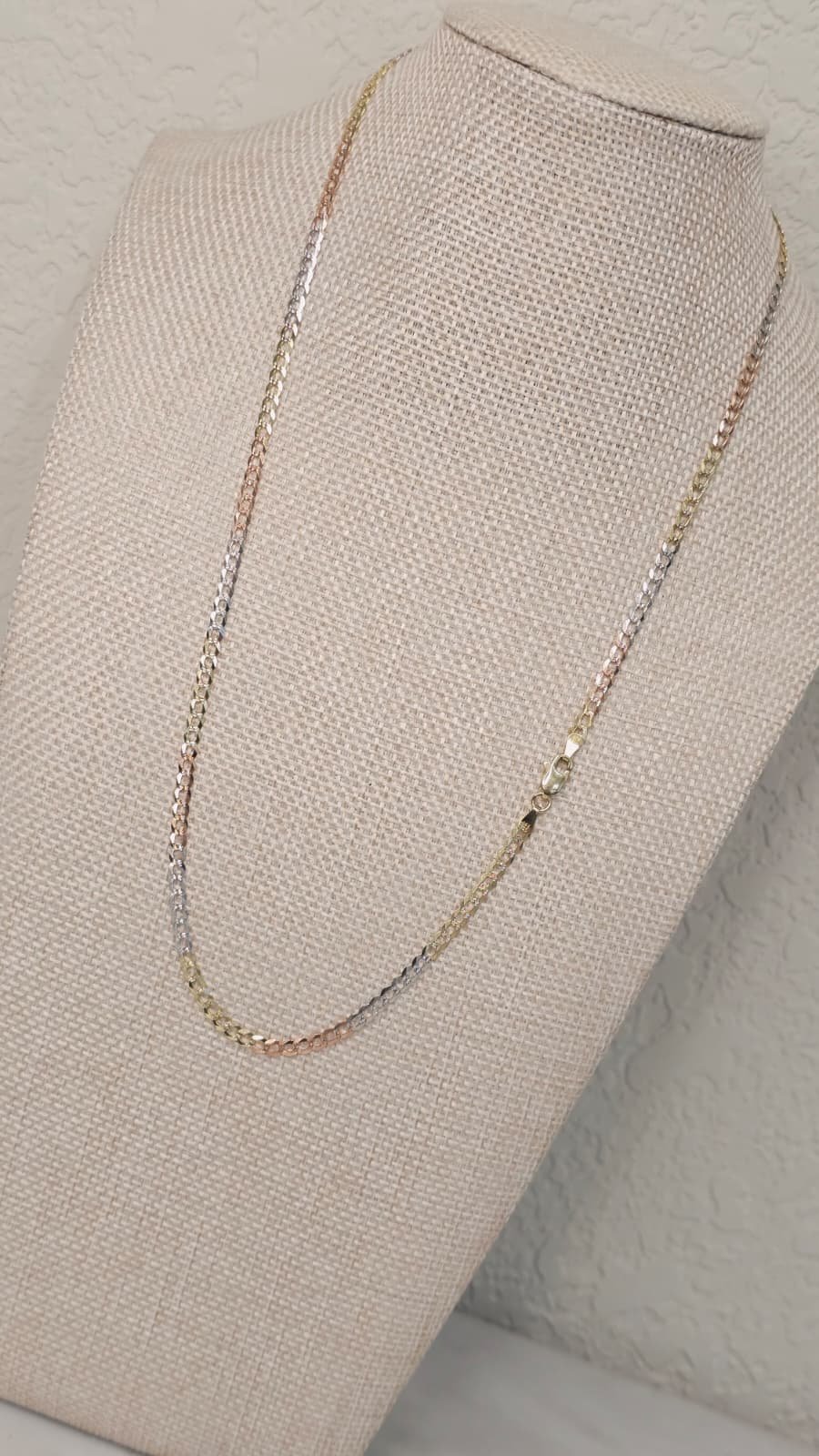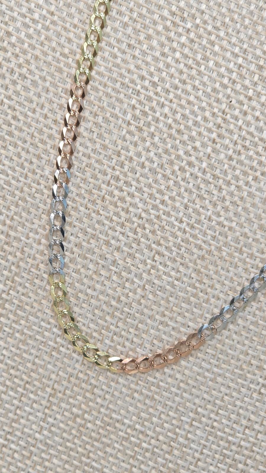Esta hermosa cadena tricolor estilo Fígaro destaca por su diseño clásico y sofisticado, combinando delicadamente tres tonos: dorado, plateado y oro rosa. Su patrón alternado crea un efecto visual elegante y moderno, ideal para quienes buscan una pieza versátil que combine con todo.