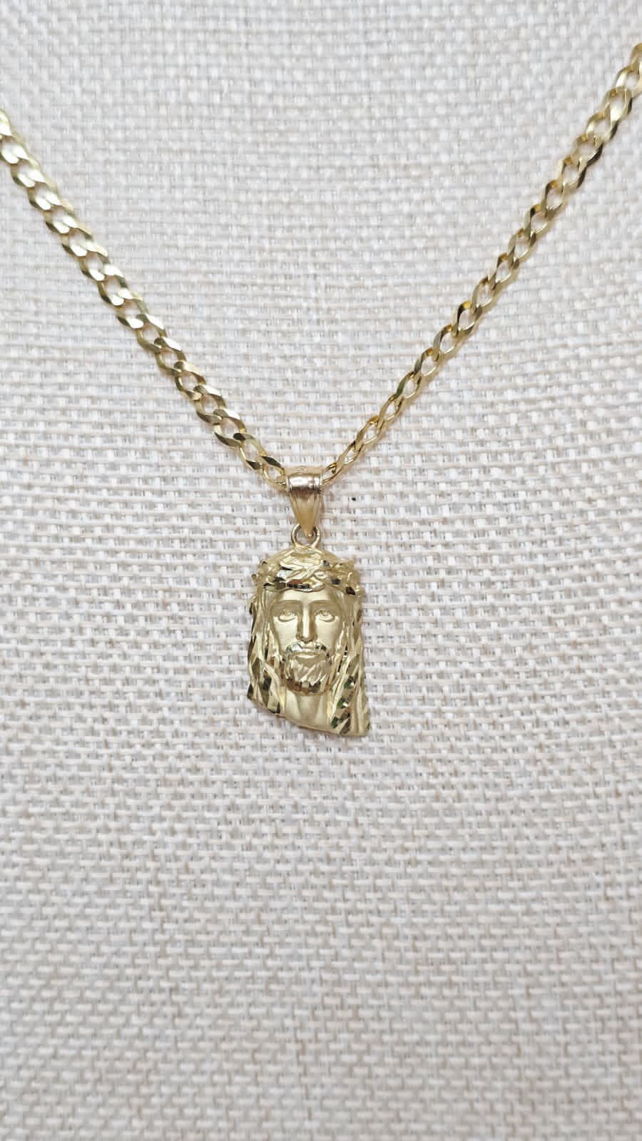 Dije de oro con diseño del rostro de Cristo en acabado tallado, símbolo de fe, protección y devoción.